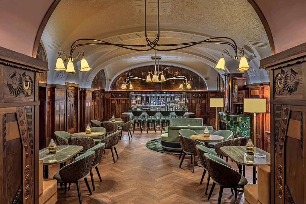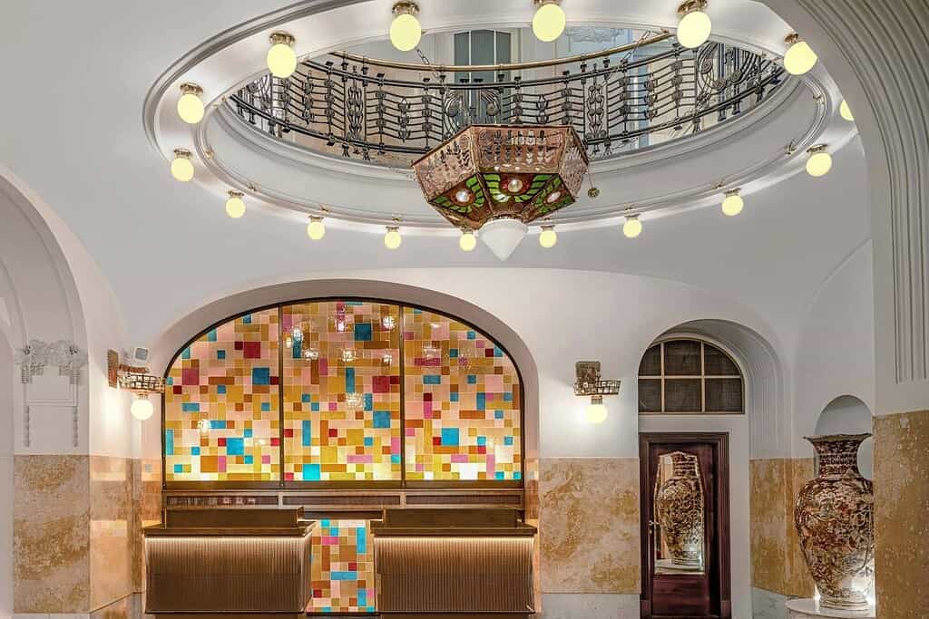 The hotel is a masterpiece of Czech Art Nouveau applied arts at its pinnacle and, simultaneously, on the precipice of the Art Deco era. The interior feels almost cinematic with handcrafted ceramic wall reliefs, mosaic tiles, intricate friezes, carved wainscoting, decorative metalwork, and Bohemian glass. Floral motifs, geometric patterns, and classical allegories draw from Greek, Egyptian, and Moorish art.